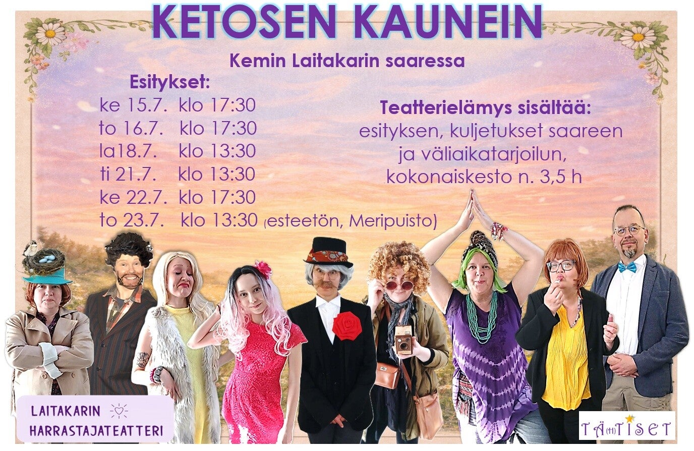 Kaikissa (pl. esteetön esitys to 23.7.) lippuun merkitty kellonaika on Leilan lähtöaika Kemin sisäsatamasta.